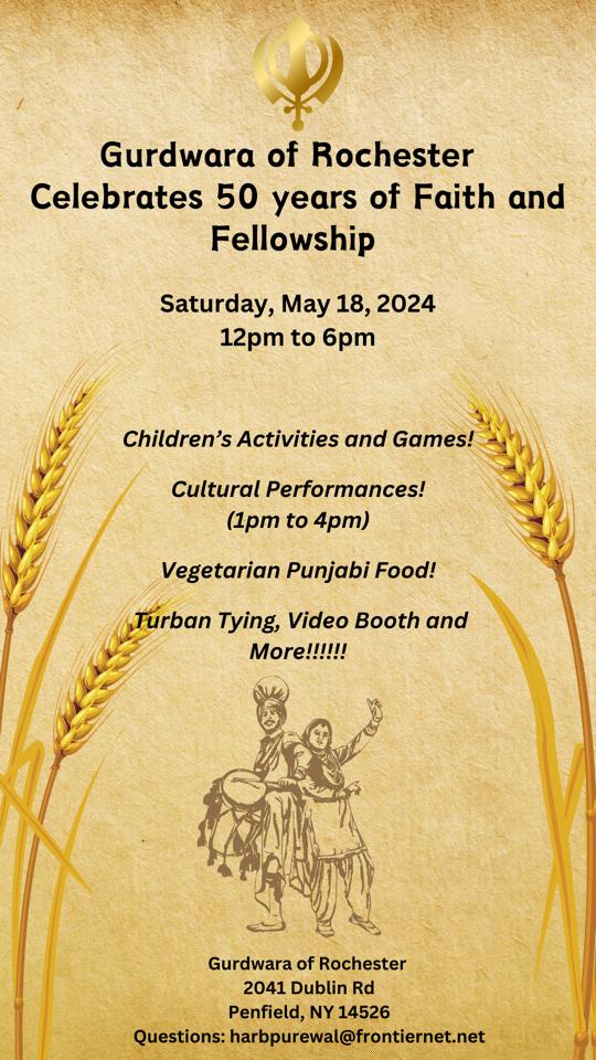 The Gurdwara of Rochester will be celebrating its 50th Anniversary on May 18th and May 19th. We are very excited to come together as a community to celebrate our faith and heritage. This historic milestone for our Gurdwara is a testament to the enduring strength and resilience of the Sikh community in Rochester. We request the sangat to fully participate in this auspicious occasion.